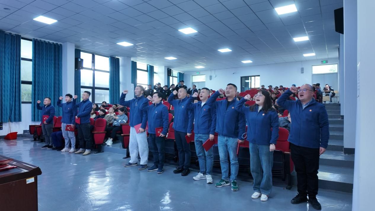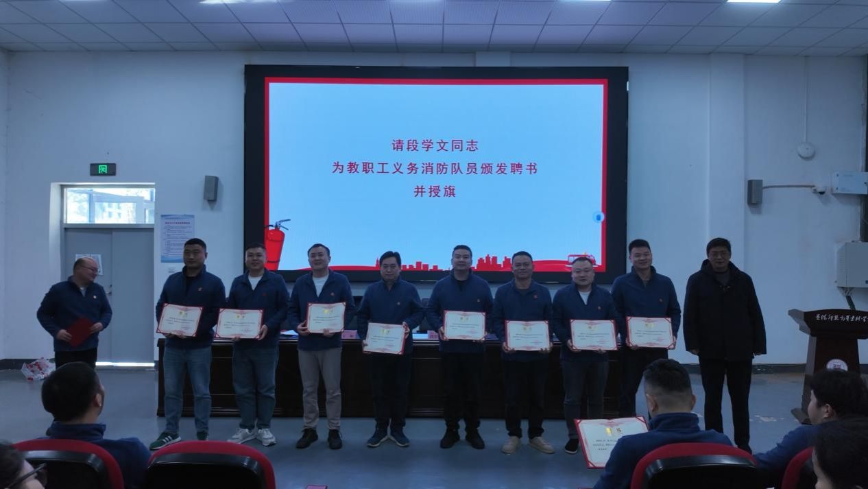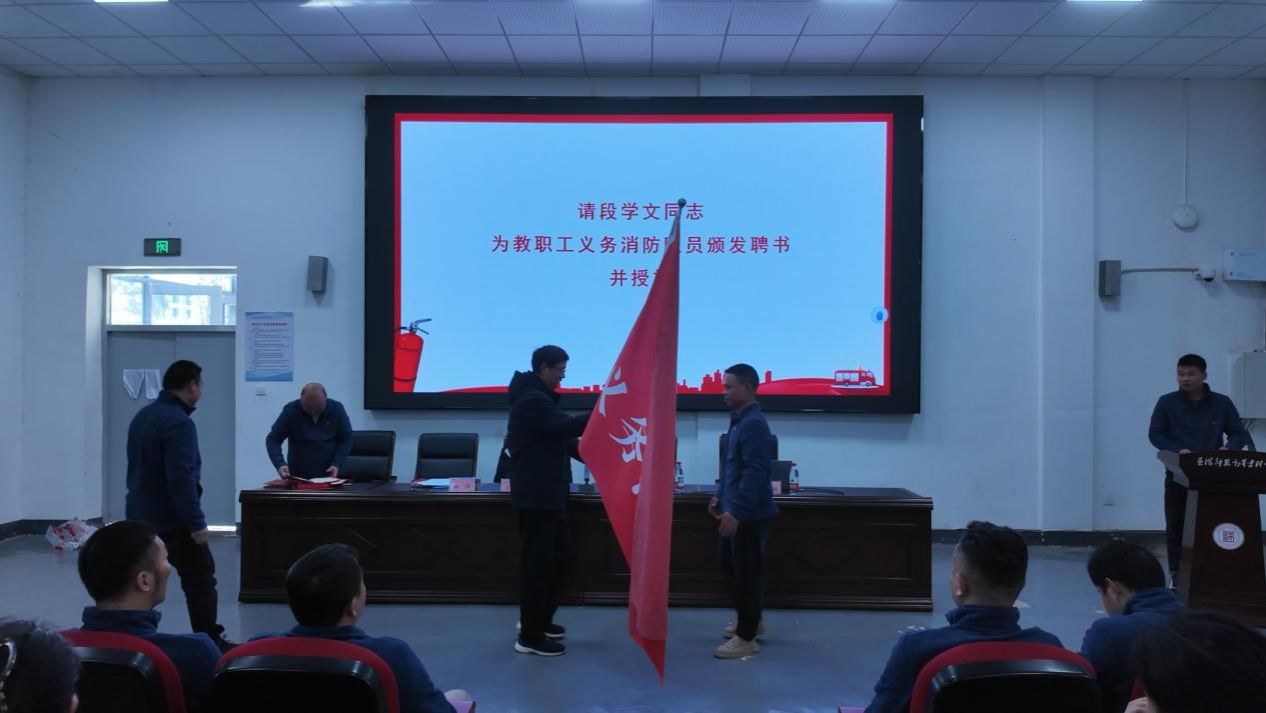 成立大会在庄重热烈的氛围中拉开帷幕。段学文宣读教职工义务消防队队员名单,为队员们郑重颁发聘书并授队旗。全体队员身着统一服装,在队长游金龙的带领下肃立宣誓,高举右拳庄严承诺:“恪尽职守、勇于担当,熟练掌握消防技能,全力守护校园平安,为建设平安和谐校园贡献力量!” 铮铮诺言彰显了义务消防队员们守护校园安全的坚定决心与责任担当。