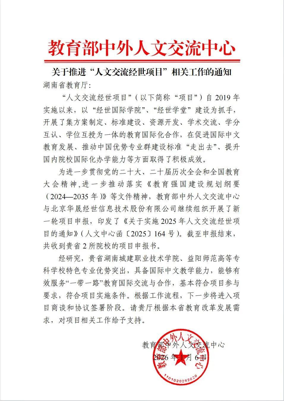 “人文交流经世项目”由教育部中外人文交流中心联合北京华晟经世信息技术有限公司共同实施,立足中国产业优势,融合数字技术,将产业创新快速转化为教育产品与教学资源,助力国内职业院校和应用技术型大学增强学科建设、课程开发、人才培养与国际合作能力。项目采用“校-校-企-企”模式,联动“走出去”的中资头部企业与中外院校,在共建“一带一路”国家共同开展境外办学、专业标准制定、教育技术升级与师生交流等合作,以数字化、国际化为牵引,促进高水平教育对外开放与人文交流。