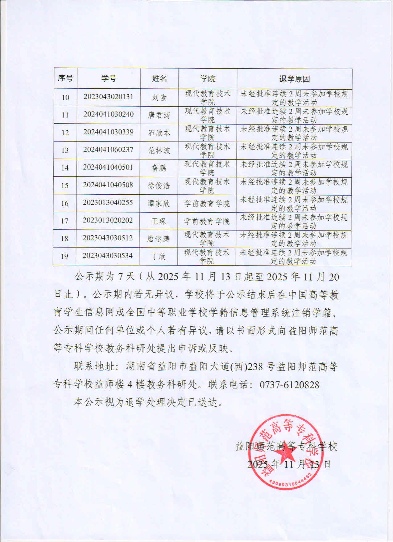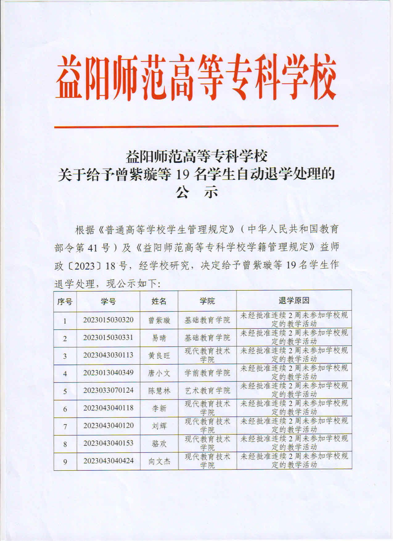 益阳师范高等专科学校关于给予曾紫璇等19名学生自动退学处理的公示